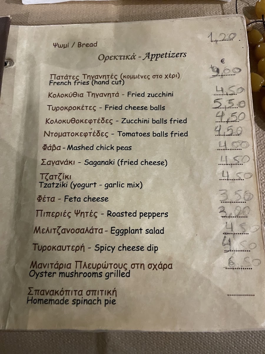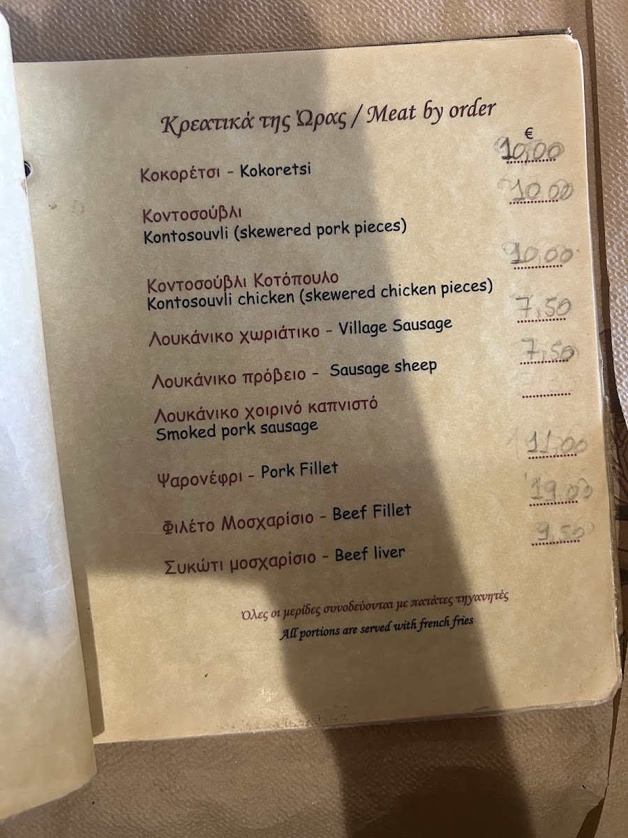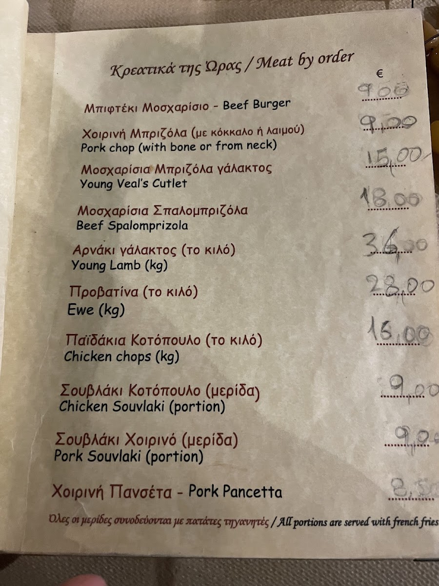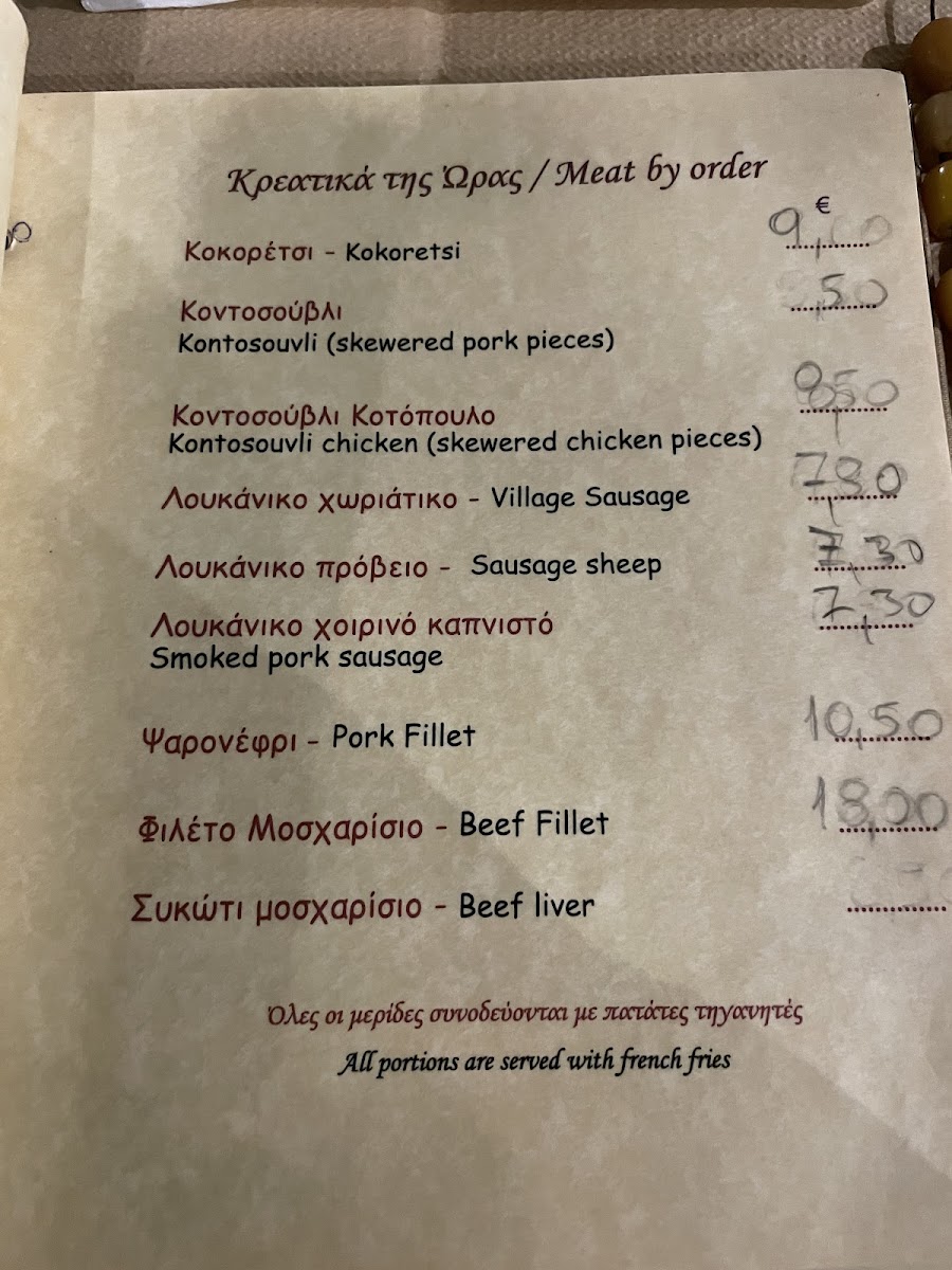 Typical offerings include grilled meats like kontosouvli pork or chicken, tender lamb chops, and rich beef dishes. Alongside these, lighter plates such as fresh village salads, homemade tzatziki, fried zucchini, and various vegetable-based appetizers complement the meat-focused main courses. These combinations make the menu well-suited for casual dinners with family or friends, often accompanied by slow, easy conversation in a welcoming atmosphere.